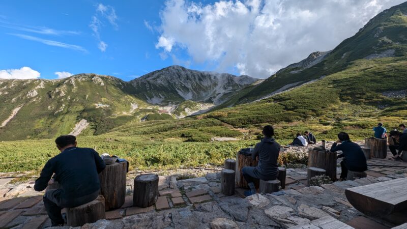 玄関前にテラス席があり、別山が綺麗に見えます。到着後はここで休憩するところから。