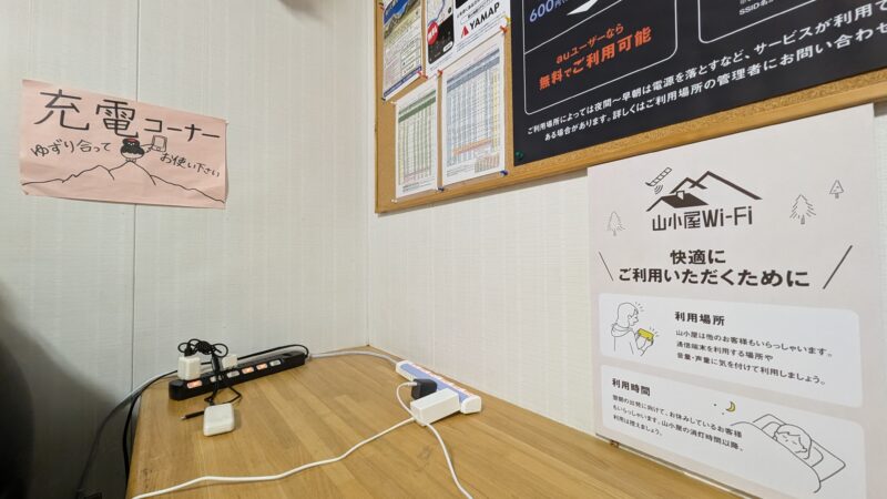 充電コーナーは無料でした。ドコモはほぼ電波なし。山小屋Wifiがありました。