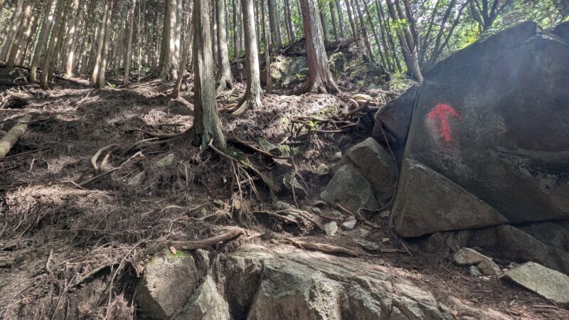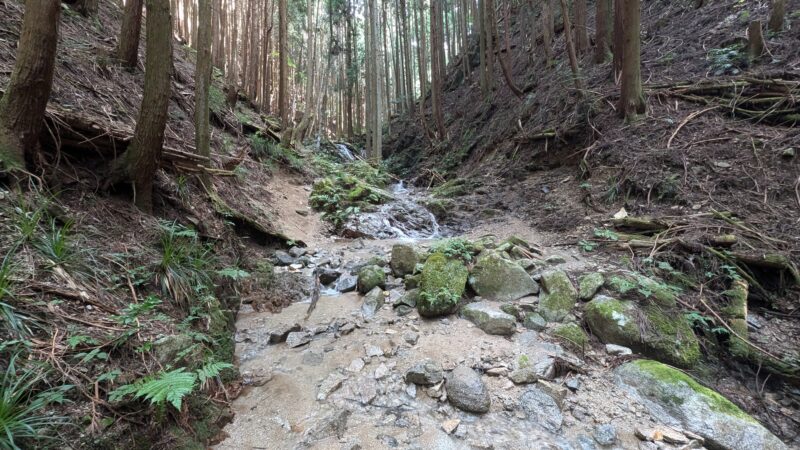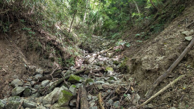 沢沿い歩きが終わると、傾斜が急になり、最後は岩だらけの枯れた沢を登るような感じになりました。