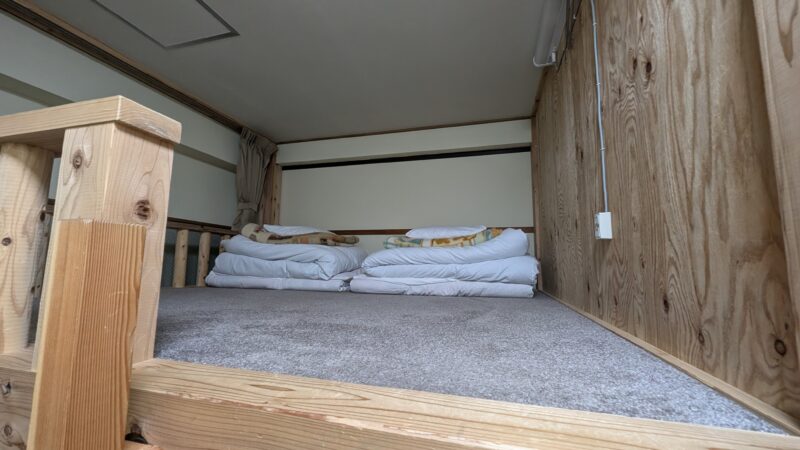 私が泊まった部屋は2段式で2人ずつで仕切りがありました。前面はカーテン。写真で伝わるかわからないのですが、とても広々しています。このタイプの区画では過去最高の広さだったと思います。ハンガーで干す場所もあるし、ライトもあるし、電源もあるし、と素晴らしいスペースでした。