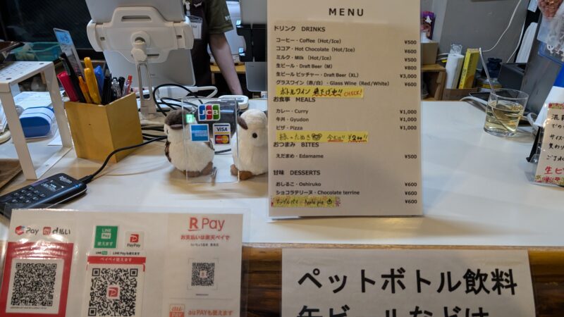 喫茶は10:00~営業。食事・デザートもあり。お酒は取り扱いの幅が広くていいのですが、食事は定番メニューって感じなので、もう少し種類あると嬉しいなと思いました。支払方法は、クレジットカードや各種電子マネーに対応。
