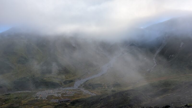単純に室堂ターミナルからの距離だとみくりが池温泉や立山室堂山荘の方が近いけど、ターミナルからは舗装路が続いていて歩きやすいし、登りたい山によってはこちらの方が便利なことも。